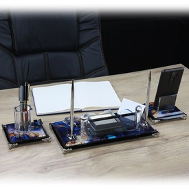 | İçerik: Kalem Seti, Telefon Standı, Küp Notluk, Notluk, Kalemlik, Kartvizitlik, Özel Lacivert Deri Kutu |